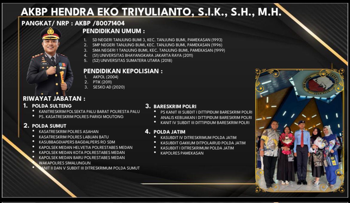 AKBP Hendra Eko Triyulianto,S.I.,S.H.,M.H adalah sosok pemimipin alumni dari SMAN 1 Tanjungbumi. Profil beliau sebagai KAPOLRES Pamekasan dan juga beberapa jabatan yang pernah di dapatkan serta prestasinya di Kepolisian Republik Indonesia menjadi sorotan pembahasan di forum ini.